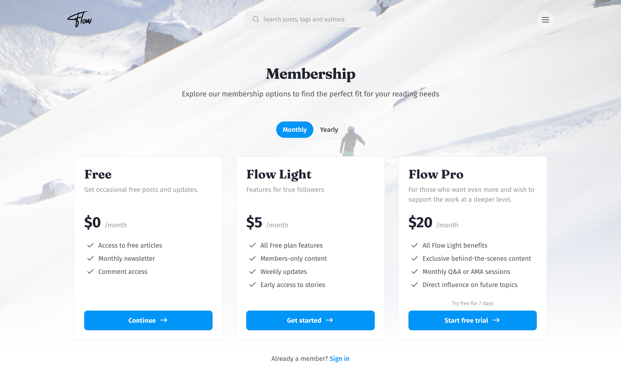 Pre-built specialized pages for Authors, Tags, Membership, and Contact. Custom Sign In/Sign Up pages with your branding create a seamless member experience.